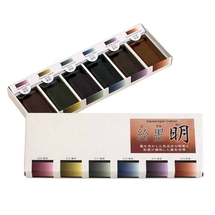 Este bello set de acuarelas Boku-Undo Mei incluye los siguientes 6 tonos: Shadow Pink (rosa), Shadow Yellow (amarillo), Shadow Green (verde), Shadow Blue (azul), Shadow Purple (morado) y Shadow Vermilion (bermellón).