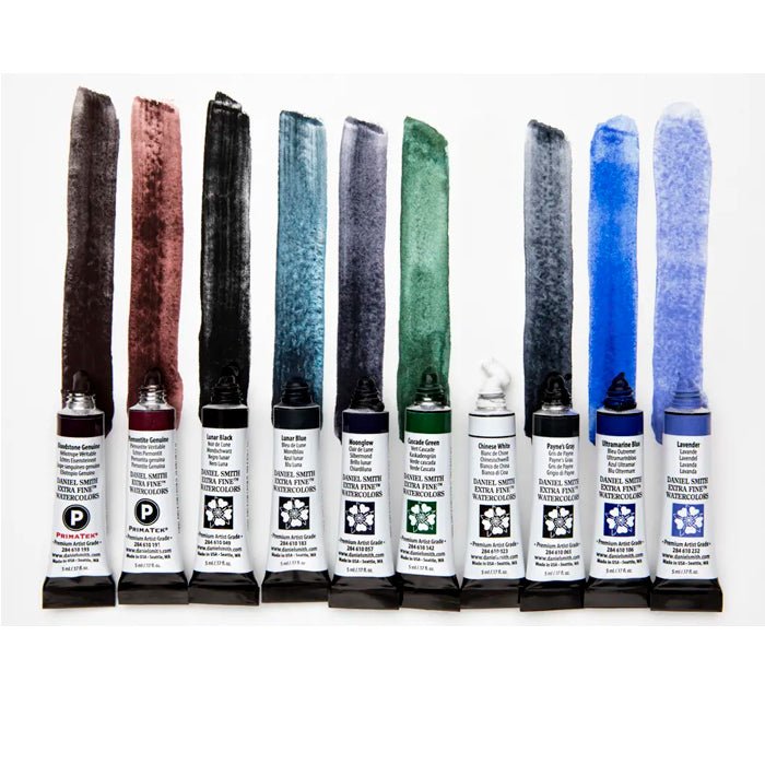 El set de acuarelas Daniel Smith Nicolas Lopez Artist Set incluye 10 tubos de acuarela de 5 ml cada uno, en los colores: jaspe sanguíneo genuino (bloodstone genuine), piemontita genuina, negro lunar, azul lunar, brillo lunar, verde cascada, blanco de China, gris de Payne, azul ultramar y lavanda.