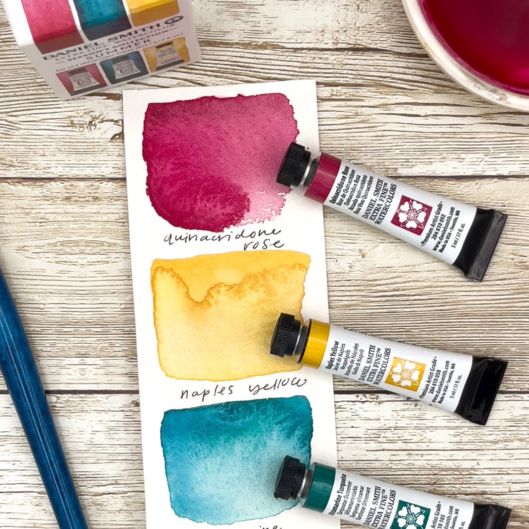 Este set incluye 3 tubos de 5ml en los colores Naples Yellow, Ultramarine Turquoise y Quinacridone Rose.