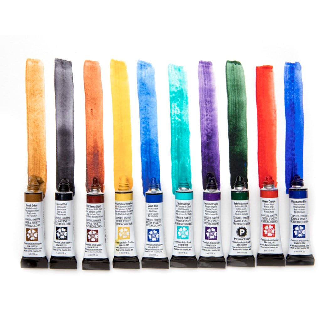 El set de acuarelas Daniel Smith Thomas Schaller's Master Set incluye 10 tubos de acuarela de 5 ml cada uno, en los colores: ocre francés, tinta neutra, siena tostada clara, amarillo de cadmio oscuro, azul cobalto, púrpura imperial, turquesa azul de cobalto, jadeíta genuina, naranja maya y azul ultramar.