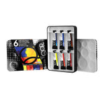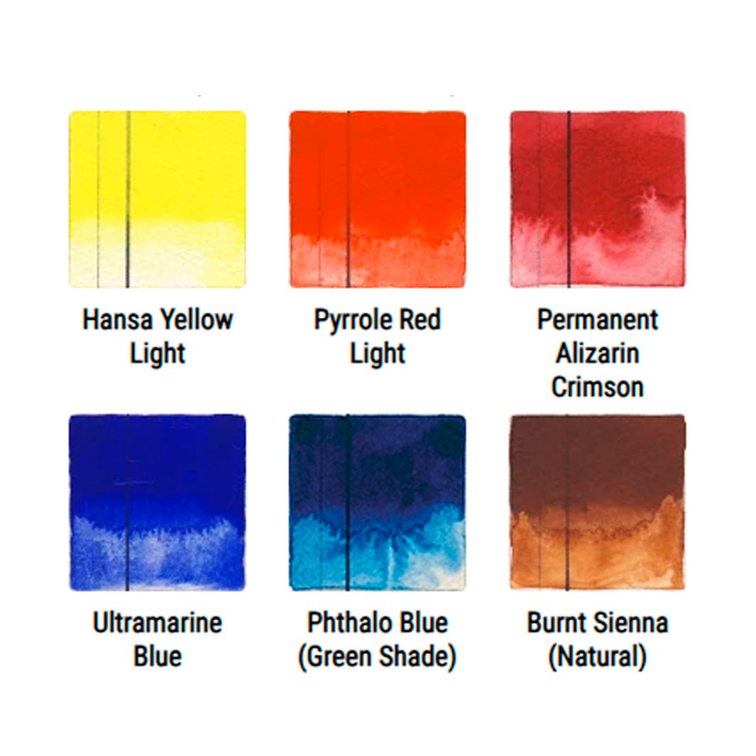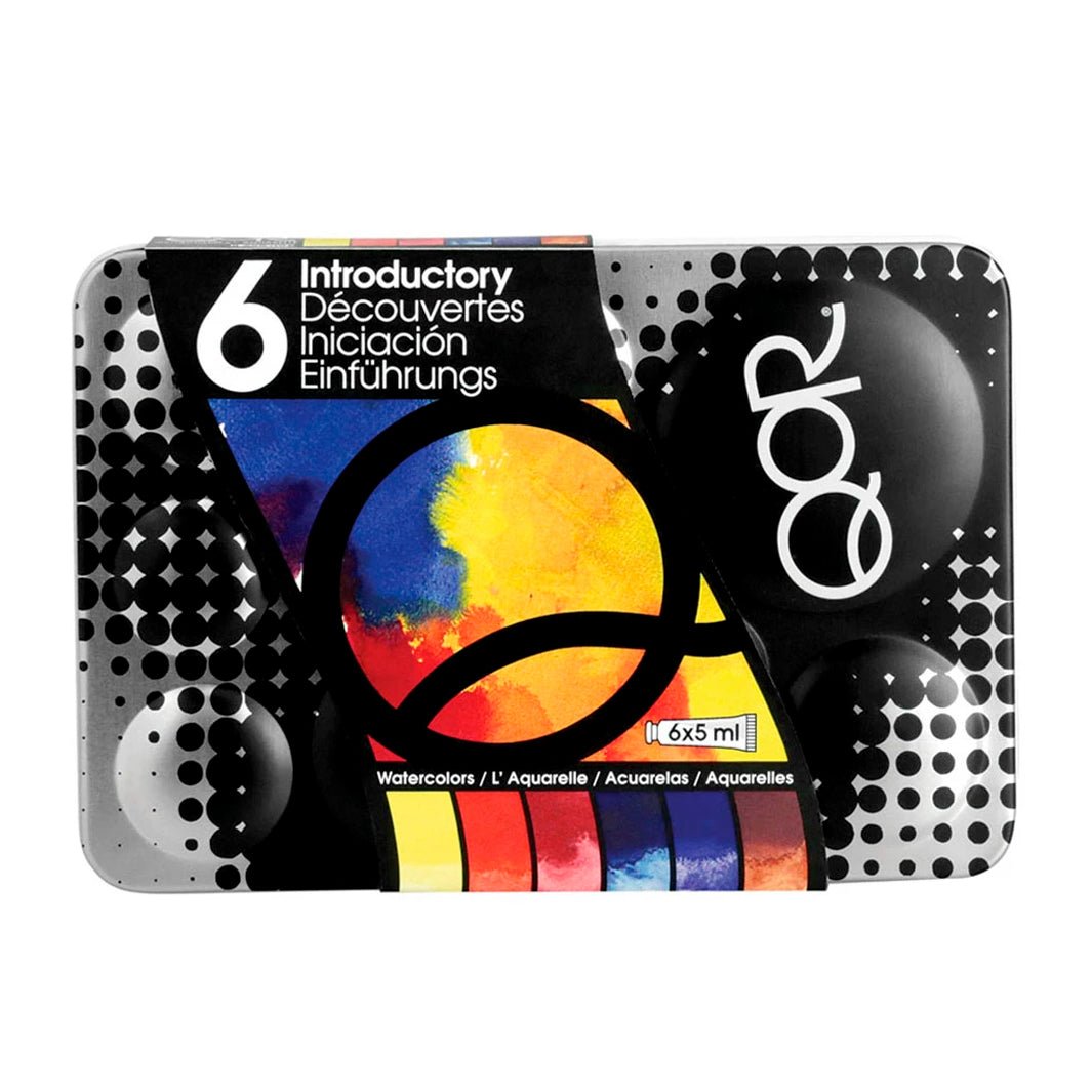 Este es el set QoR Iniciación con 6 (Introductory). Incluye 6 tubos de 5ml en una gama de tonos básicos: Amarillo Hansa Claro, Rojo Pirrolo Claro, Carmesí de Alizarina Permanente, Azul Ultramar, Azul Ftalo (Tono Verde) y Siena Tostada.