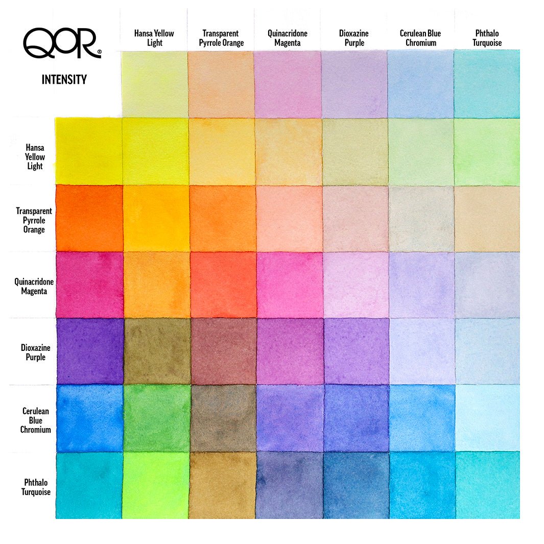 Este es el set Mini Set Intensos de QoR (QoR Mini Intensity), que incluye 6 medias pastillas con colores seleccionados especialmente para crear mezclas brillantes y limpias: Amarillo Hansa Claro, Naranja Pirrolo Transparente, Magenta de Quinacridona, Púrpura Dioxacina, Azul Cerúleo Cromo y Turquesa Ftalo.
