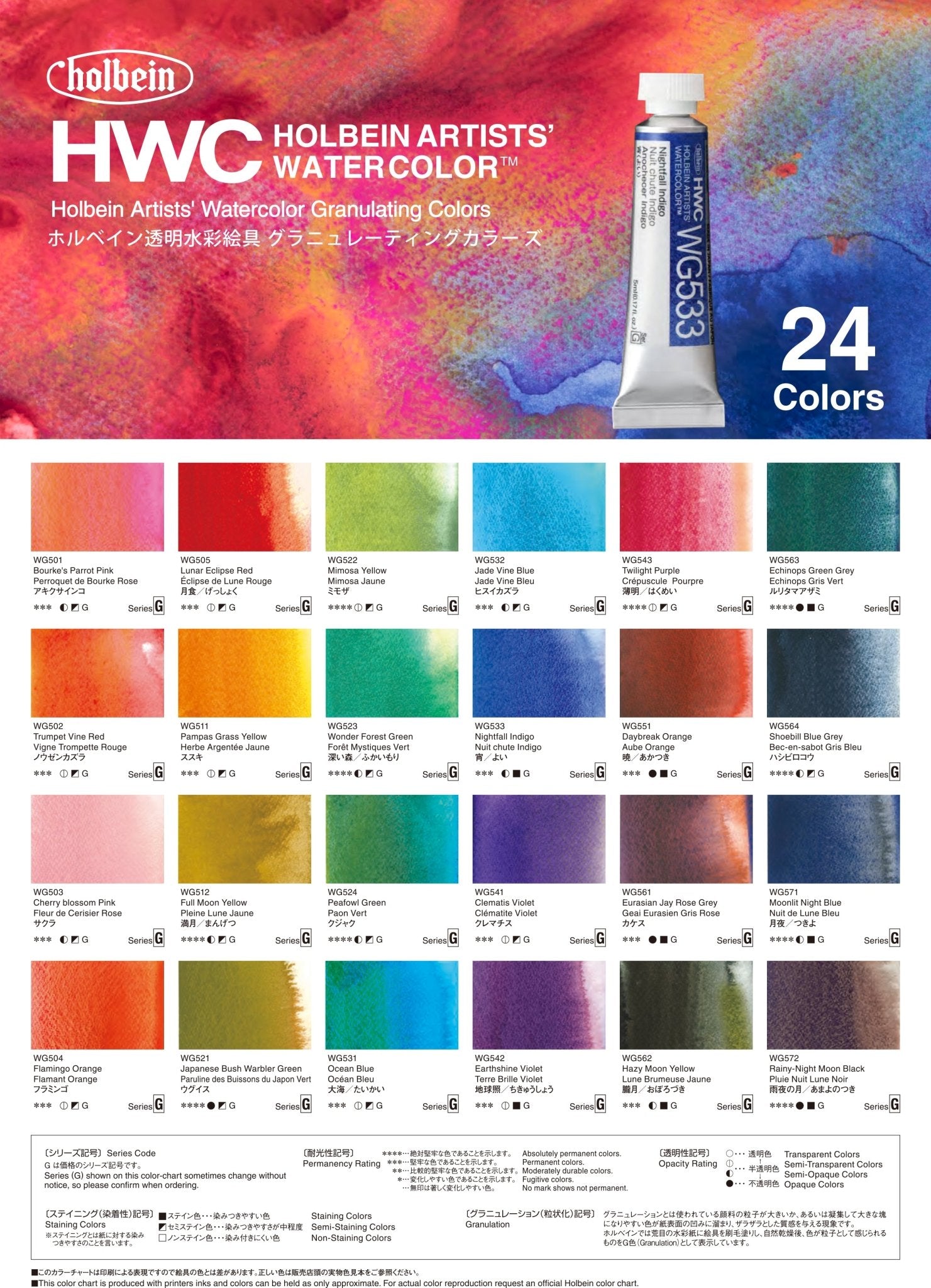 Este set trae la gama completa con los 24 colores granulantes de Holbein: encontrarás colores súper intensos con diferentes grados de textura e incluso con ciertos efectos de separación de color. Estos efectos se lucirán más en papeles con textura gruesa, ¡experimenta usando diferentes cantidades de agua!