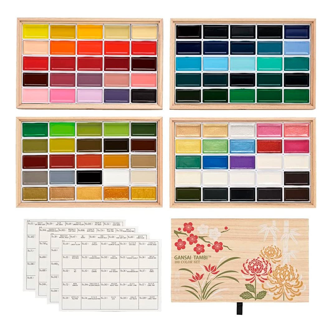 Las acuarelas Kuretake Gansai Tambi son acuarelas tradicionales japonesas de excelente calidad. Todos los colores son muy vivos y casi todos tienen buena resistencia a la luz. Las Gansai Tambi están elaboradas de manera artesanal a partir de goma arábiga y cola animal como aglutinante; debido a esto, el resultado final será menos transparente que el de las acuarelas occidentales.