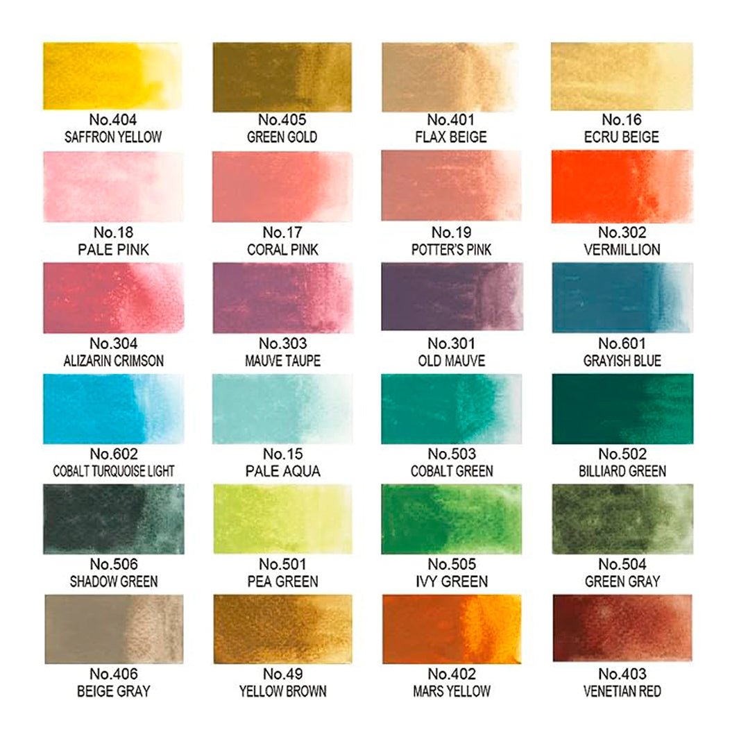 Nota: Debido a que no contienen goma arábiga como aglutinante, es posible que algunas pastillas estén cuarteadas – esto es normal en este tipo de acuarela y no afecta en lo absoluto su calidad.