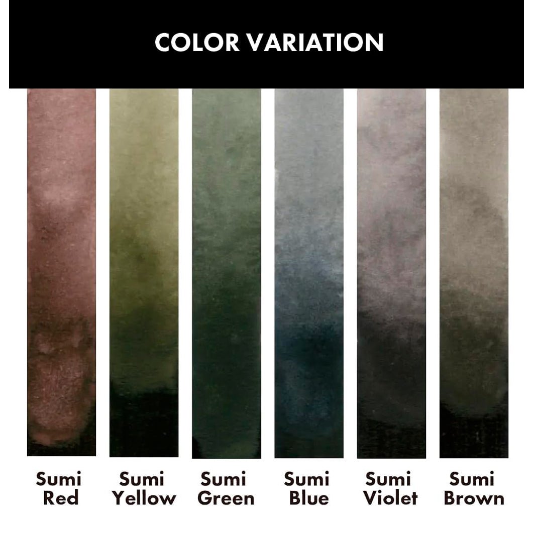 Las acuarelas Gansai Tambi Sumi Colors incluyen 6 colores: Sumi Red, Sumi Yellow, Sumi Green, Sumi Blue, Sumi Violet y Sumi Brown.
