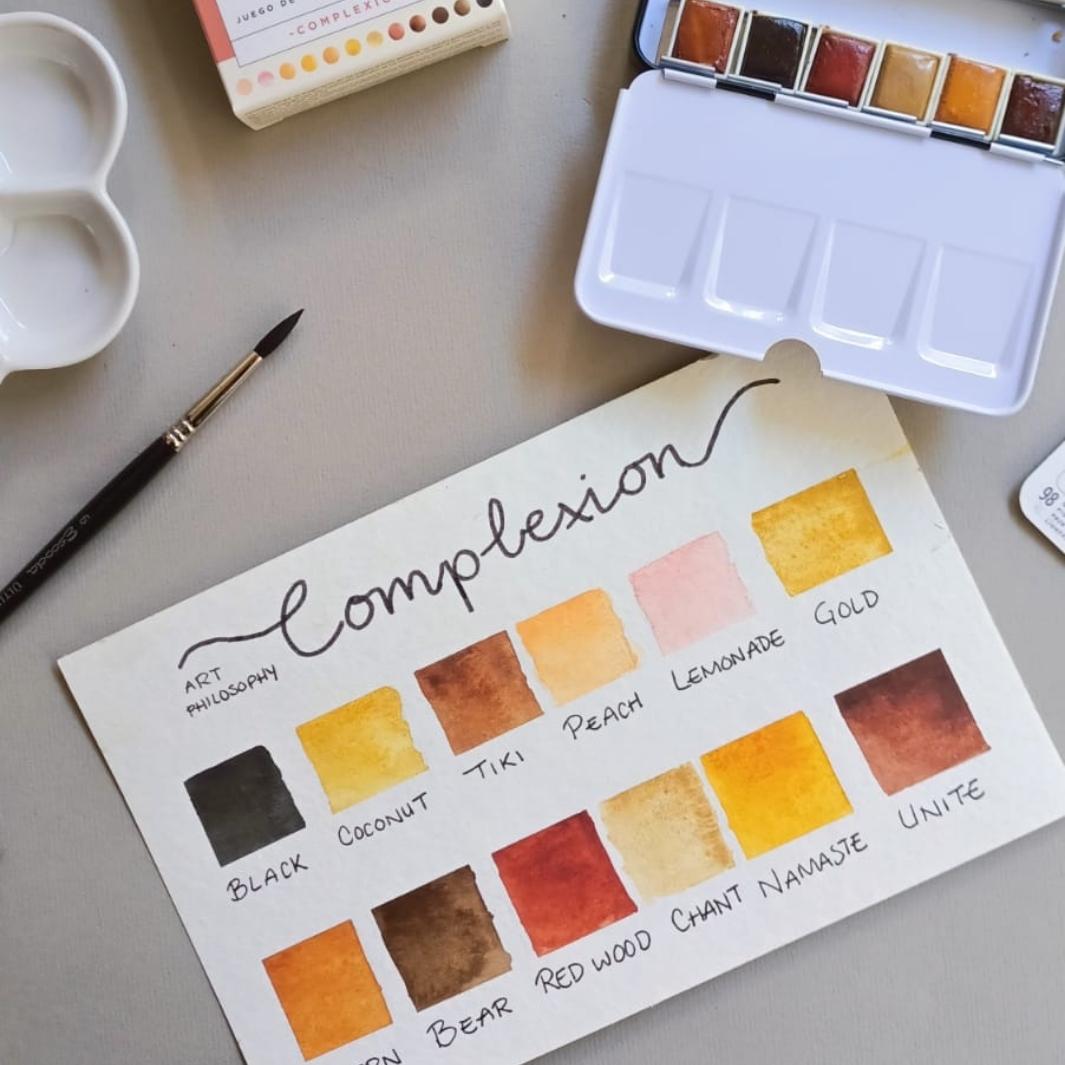 Este es el set Complexion de la colección de acuarelas Confections de Art Philosophy. Los colores de este set fueron elegidos para pintar retrato: tonos piel, marrones cálidos y negro. ¡Es perfecto para completar tu colección de acuarelas!
