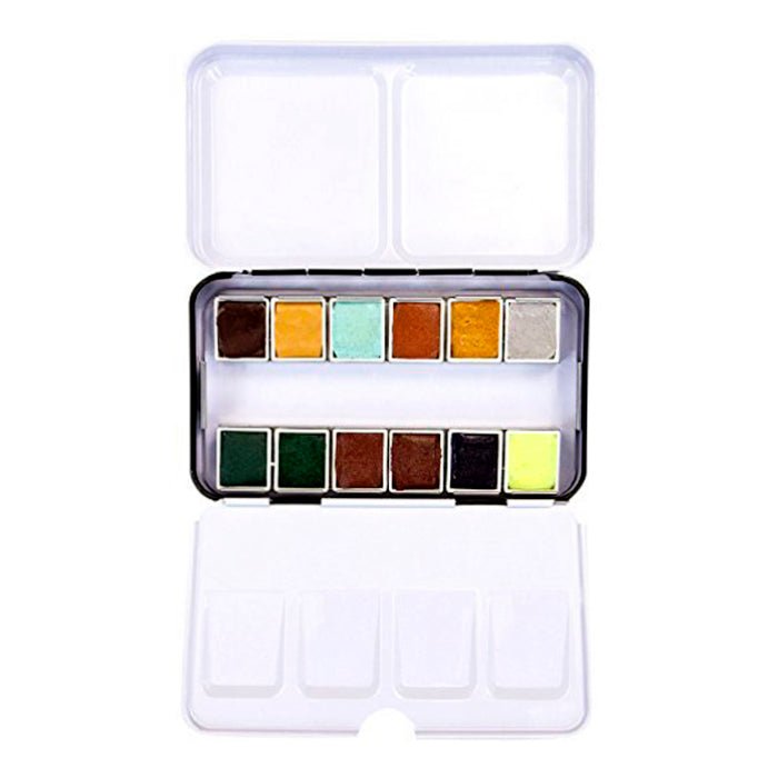 Cada estuche trae una carcasa metálica con 12 pastillas de acuarela y dos áreas plegables para mezclar.