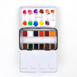 Cada estuche trae una carcasa metálica con 12 pastillas de acuarela y dos áreas plegables para mezclar.