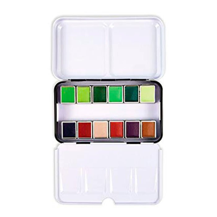 Cada estuche trae una carcasa metálica con 12 pastillas de acuarela y dos áreas plegables para mezclar.