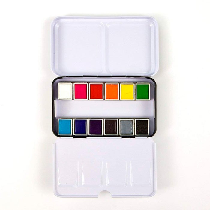 Cada estuche trae una carcasa metálica con 12 pastillas de acuarela y dos áreas plegables para mezclar.