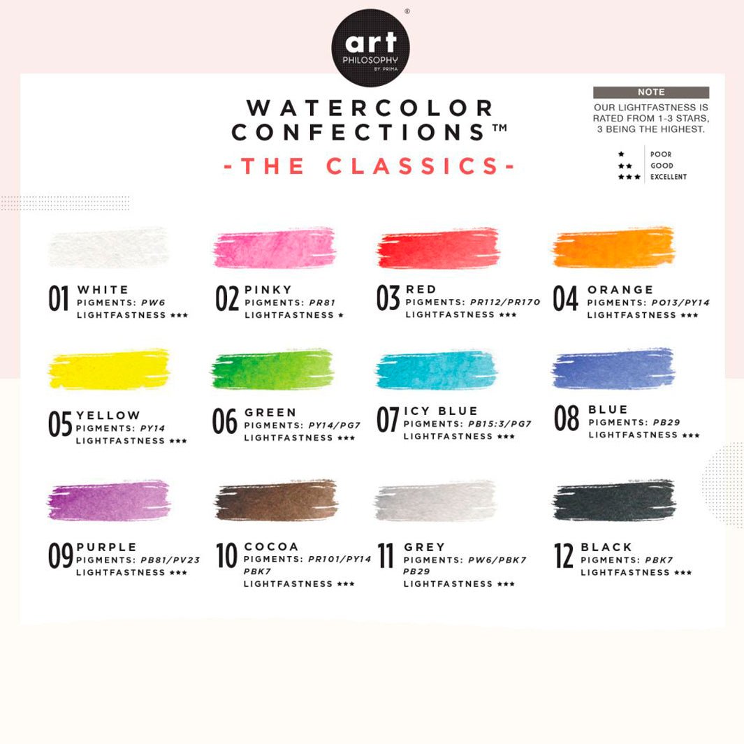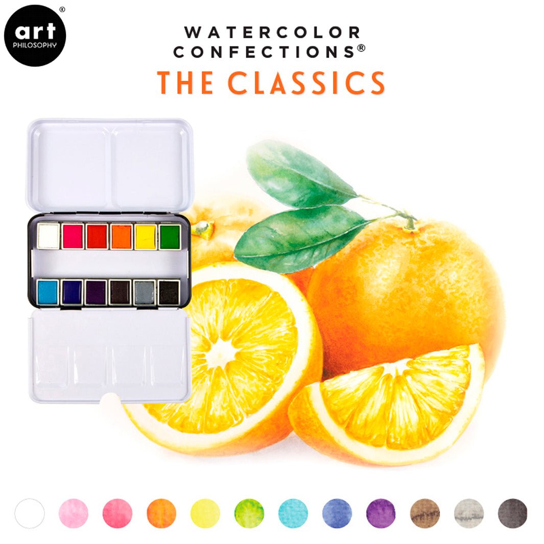 Las Art Philosophy Confections son acuarelas semiprofesionales de excelente calidad, súper pigmentadas y portátiles. Todos los colores son brillantes e intensos, perfectos para artistas, ilustradores y diseñadores.