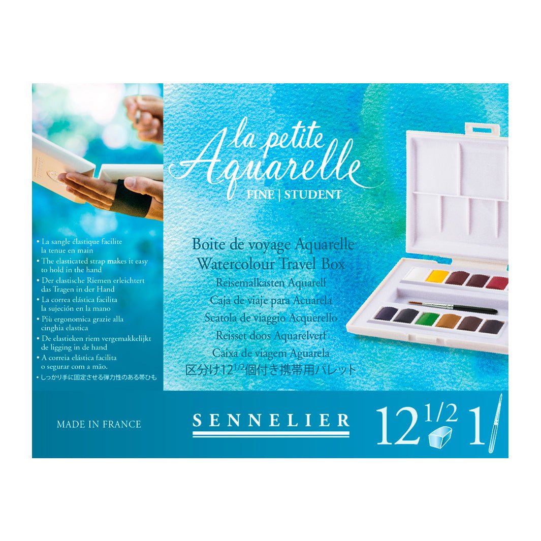Cada estuche viene con el logo de Sennelier a relieve. Por dentro trae 12 medias pastillas con colores súper mezclables entre sí y un pincel de acuarela chiquito. Y por atrás, encontrarás una banda elástica que te ayudará a pintar cómodamente de pie o en exteriores.