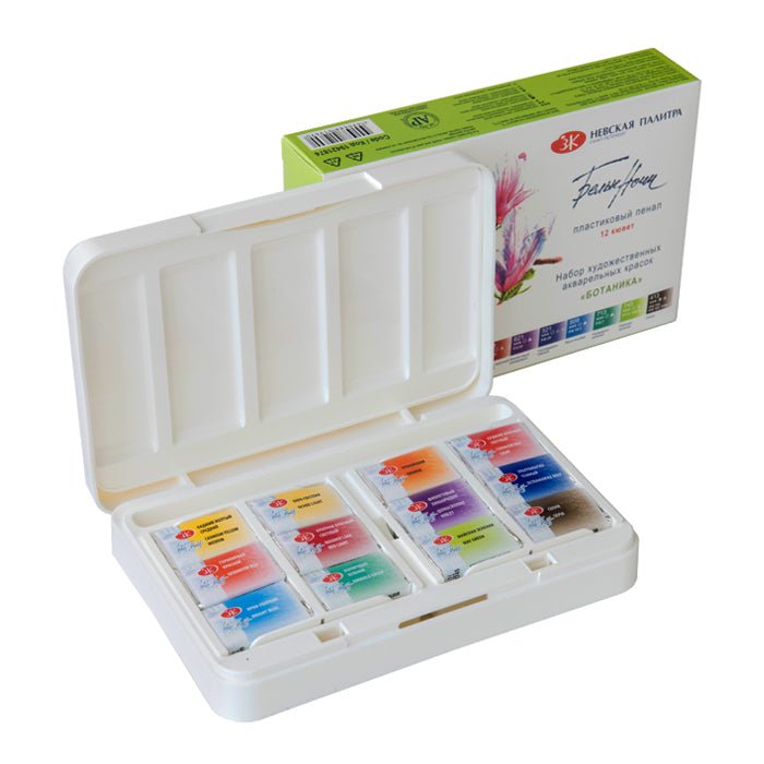 El estuche de acuarelas White Nights Botánica con 12 trae 2 prácticas paletas para mezclar e incluye los colores Limón 214, Amarillo de Cadmio Medio 201, Ocre Claro 206, Naranja 315, Rosa Quinacridona 324, Rojo Geranio 364, Rojo Alizarina Claro 313, Violeta Quinacridona 621, Ultramar oscuro 521, Azul Luminoso 509, Verde 725 y Sepia 413.