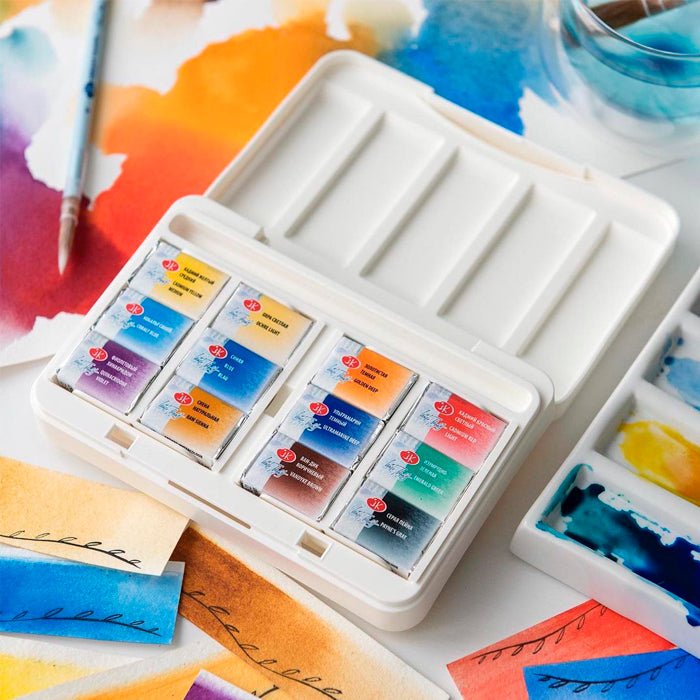 El estuche de acuarelas White Nights Paisaje Urbano con 12 trae 2 prácticas paletas para mezclar e incluye los colores Cadmium Yellow Medium, Ochre Light, Golden Deep, Cadmium Red Light, Cobalt Blue, Blue, Ultramarine Deep, Emerald Green, Quinacridone Violet, Raw Sienna, Vandyke Brown y Payne's Green.