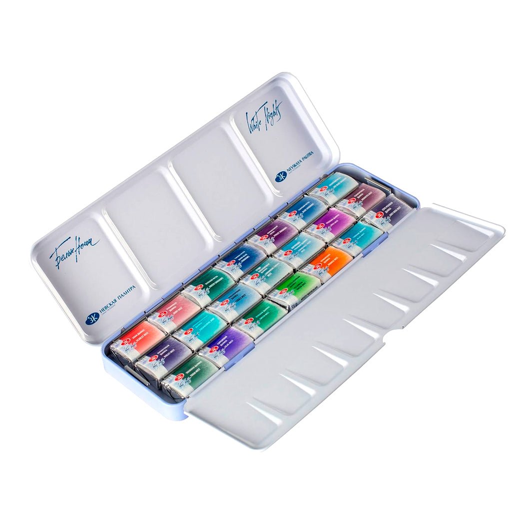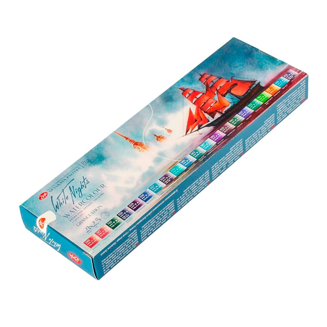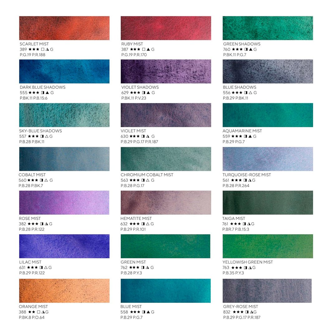 El estuche de acuarelas White Nights con 21 tonos granulados incluye los siguientes colores: Scarlet Mist, Ruby Mist, Green Shadows, Dark Blue Shadows, Violet Shadows, Blue Shadows, Sky-Blue Shadows, Violet Mist, Aquamarine Mist, Cobalt Mist, Chromium Cobalt Mist, Turquoise Rose Mist, Rose Mist, Hematite Mist, Taiga Mist, Lilac Mist, Green Mist, Yellowish-Green Mist, Orange Mist, Blue Mist y Grey-Rose Mist.