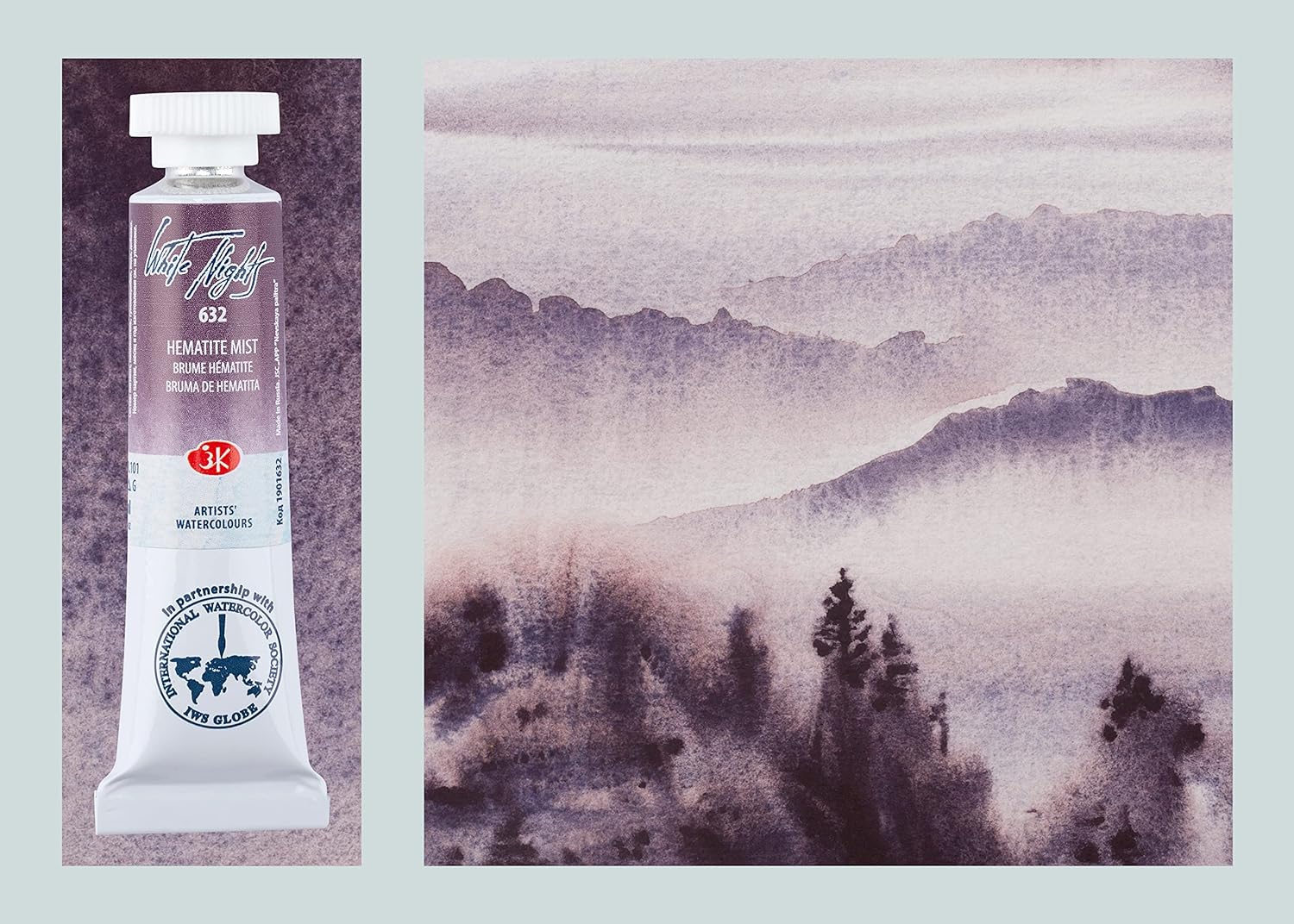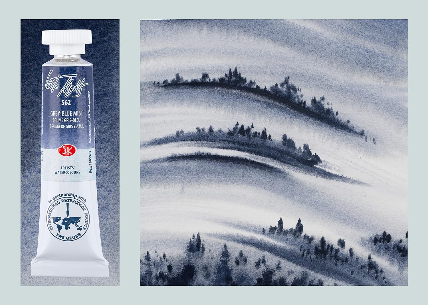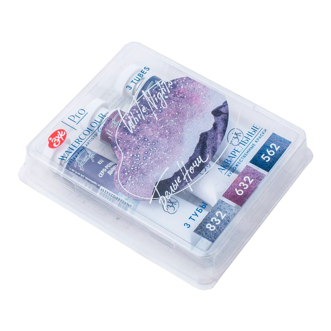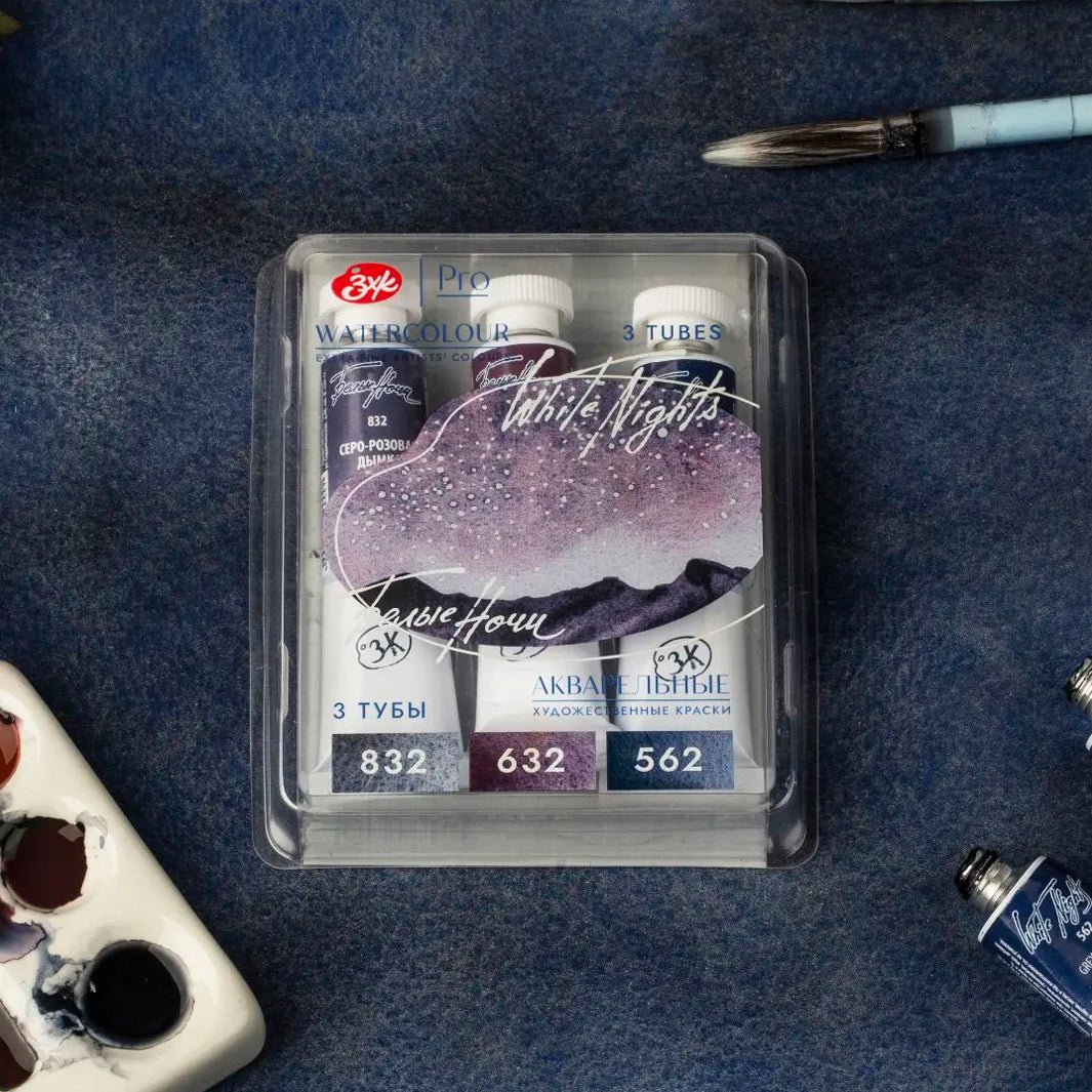 Este mini set de acuarelas White Nights Space trae los colores Grey-pink Mist, Hematite Mist, Grey-blue Mist, todos en presentación de tubo de 10 ml.