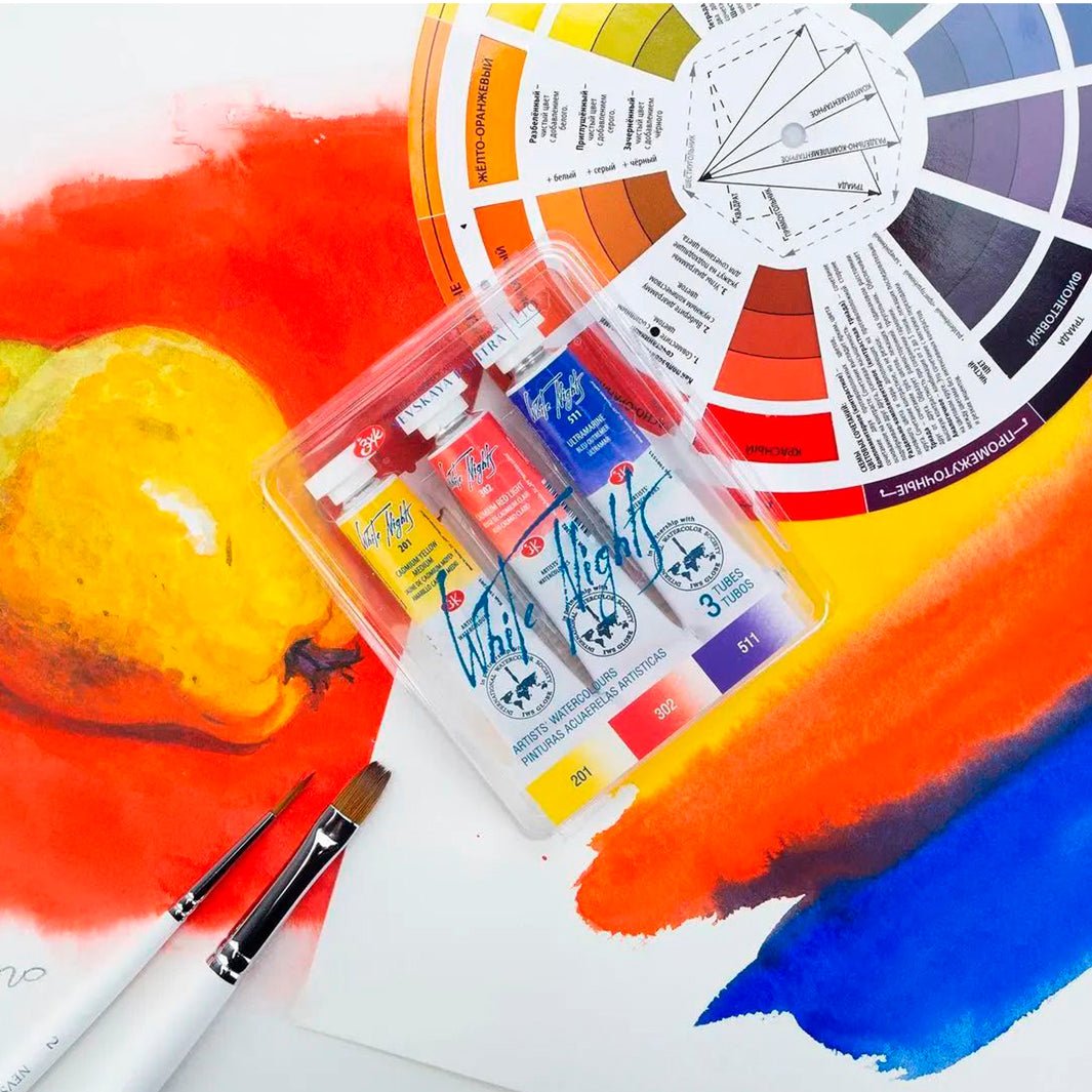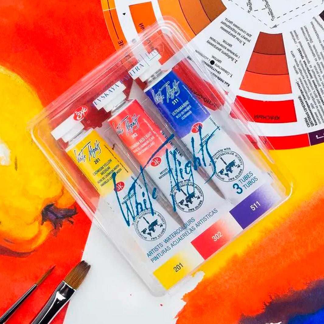 Este mini set de acuarelas White Nights trae 3 colores primarios, cada uno de 10 ml: 511 Ultramarino, 302 Rojo Cadmio Claro y 201 Amarillo de Cadmio Medio.