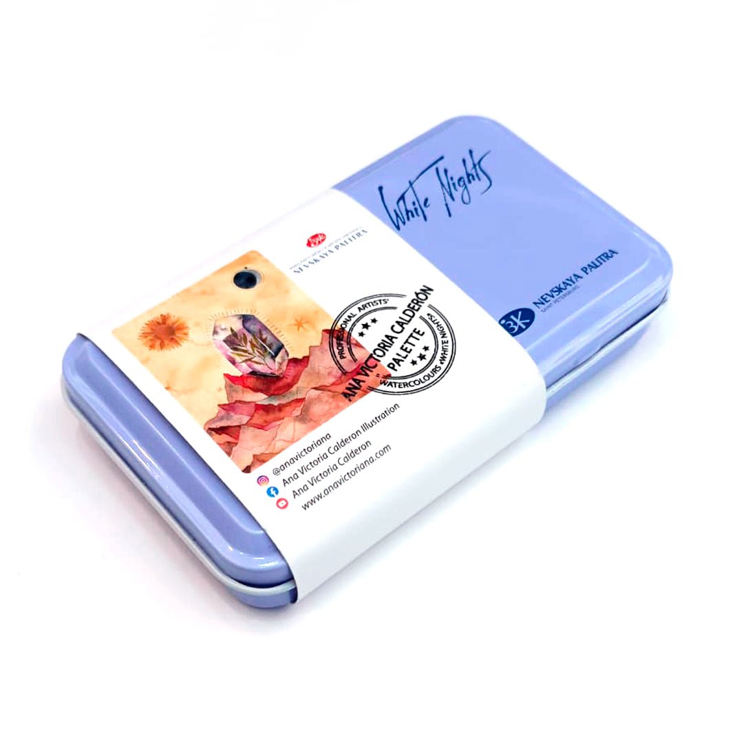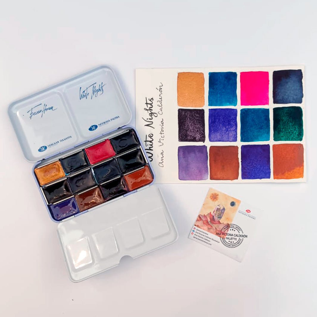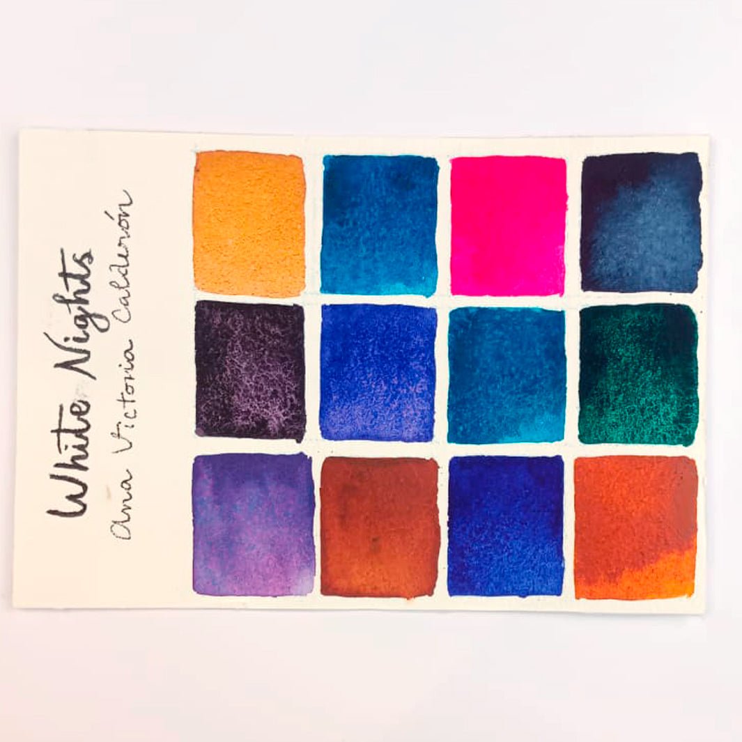 ¡Una colaboración de ensueño! Esta paleta de White Nights trae una gama seleccionada personalmente por la increíble acuarelista mexicana Ana Victoria Calderón: tonos dorados, azules, rosas, morados y mucha granulación. ¡Tienes que probarlo!