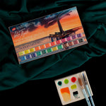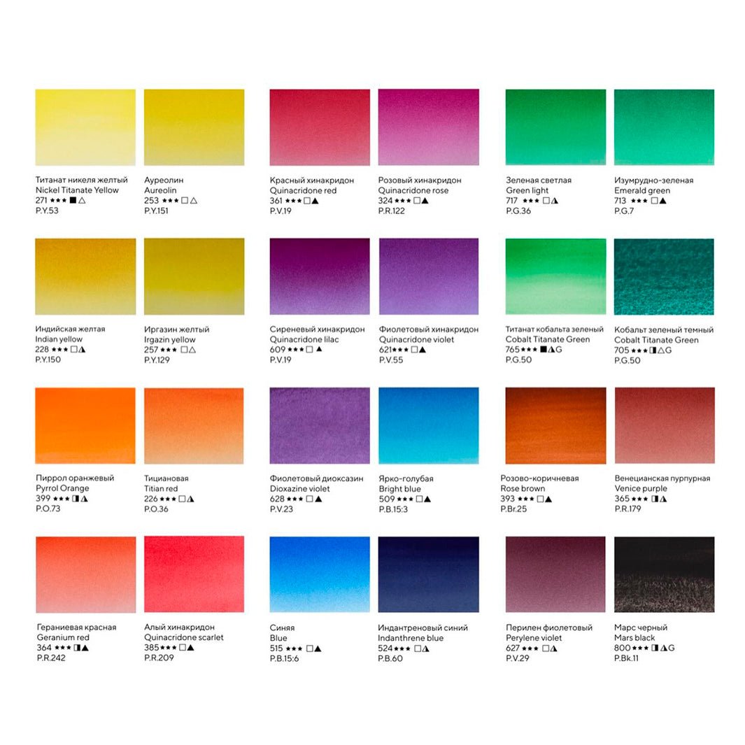 Esta paleta incluye los siguientes tonos: Nickel Titinate Yellow, Aureolin, Indian Yellow, Pyrrol Orange, Titian Red, Geranium Red, Quinacridone Scarlet, Quinacridone Red, Quinacridone Rose, Quinacridone Lilac, Quinacridone Violet, Dioxazine Violet, Bright Blue, Blue, Indanthrene Blue, Emerald Green, Cobalt Green Deep, Green Light, Irgazin Yellow, Cobalt Titanate Green, Rose Brown, Venice Purple, Perylene Violet y Mars Black. ¡Pinceles y paletas externas no incluidos!