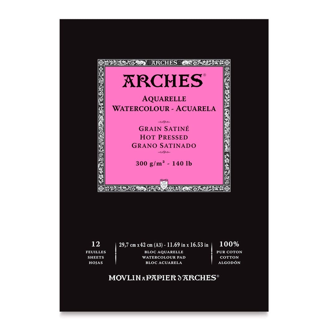 Este block de papel Arches Aquarelle hot press viene engomado en la parte superior y trae 12 hojas de 300 g, 100% algodón.