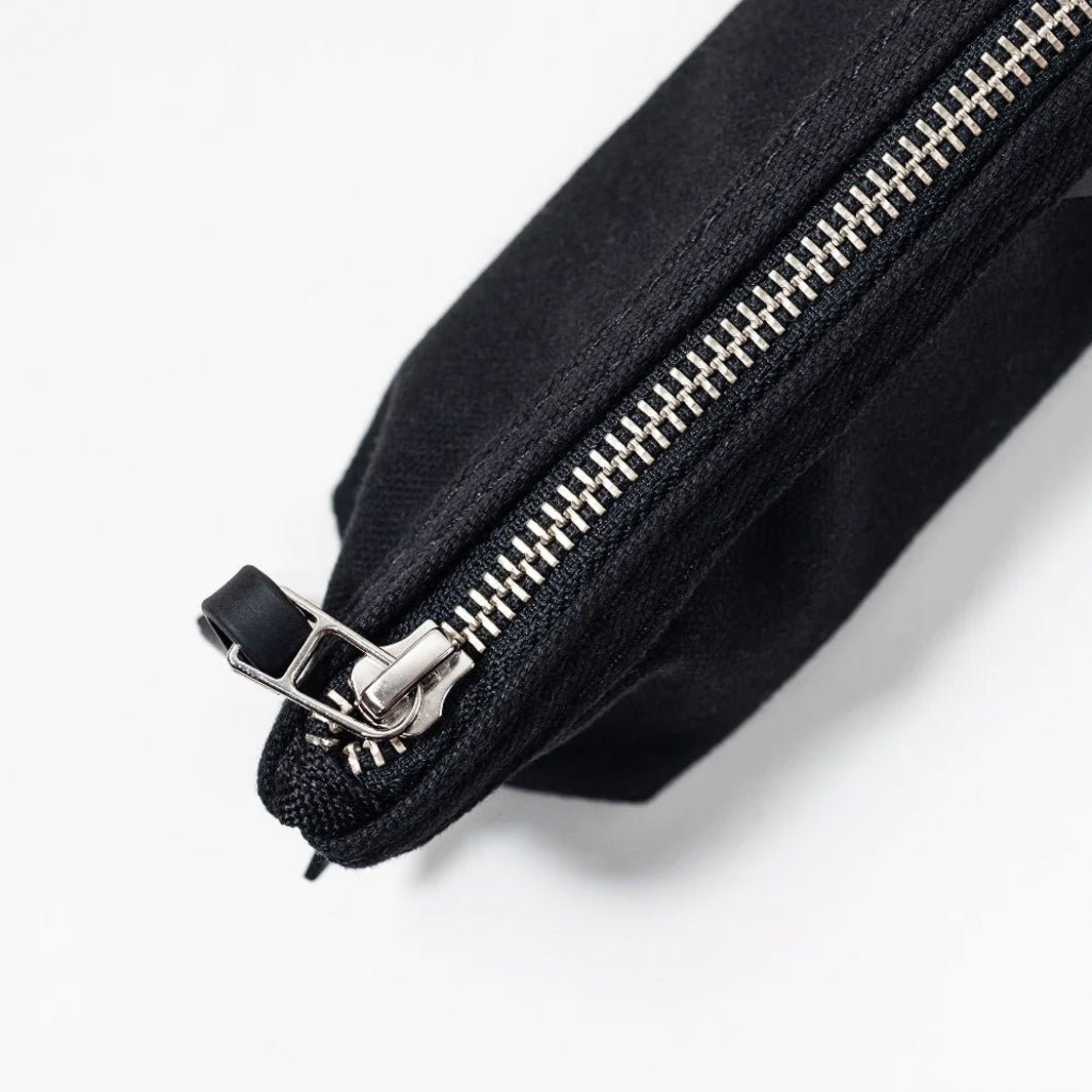 Esta lapicera está hecha de loneta de algodón color negro y tiene un cierre metálico que se desliza suavecito sin atorarse en la tela. Nos encantan las excelentes costuras del cuerpo de la lapicera.