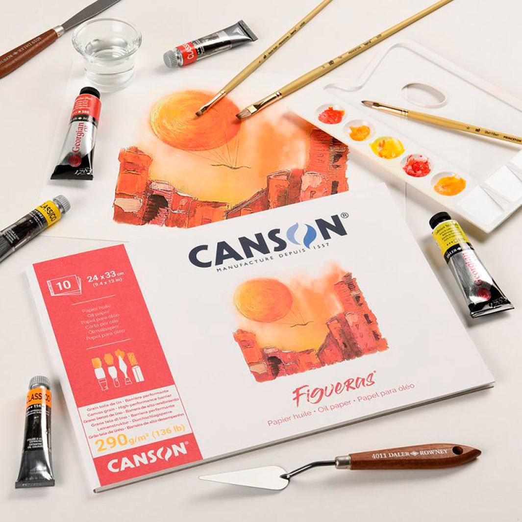 El block de papel Canson Figueras tiene un papel diseñado especialmente para pintura al óleo. Este bello papel tiene una textura similar al lienzo de lino y viene preparado especialmente para resistir los aceites y solventes sin que la pintura traspase a la parte de atrás. ¡Es excelente!