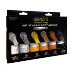 Este es el set de Colores Metálicos e incluye 6 tubos de acrílico de 100 ml en los siguientes tonos: 180 Blanco Perla, 181 Plata, 182 Oro, 184 Bronce, 185 Cobre y 187 Negro Metálico.