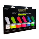 Este es el set de Colores Neón e incluye 6 tubos de acrílico de 100 ml en los siguientes tonos: 190 Blanco Fluorescente, 191 Amarillo Fluorescente, 193 Naranja Fluorescente, 195 Rosa Fluorescente, 196 Azul Fluorescente y 197 Verde Fluorescente.
