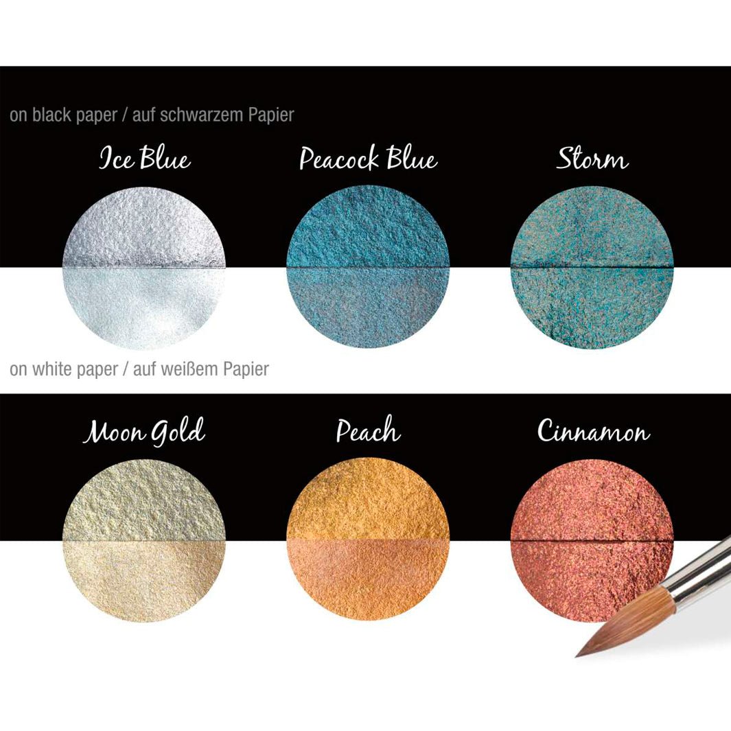 Este es el set de acuarelas Coliro Aquarius, una colaboración con la artista alemana Andrea Schlemmer. Este estuche trae 6 pastillas en los siguientes colores: Ice Blue, Peacock Blue, Storm, Moon Gold, Peach y Cinnamon.