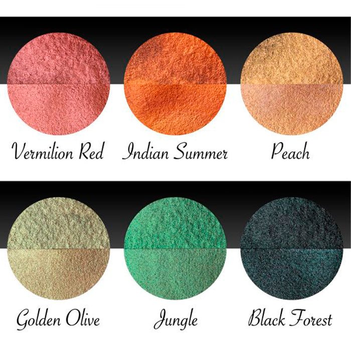 Este es el set de acuarelas Coliro Autumn. Este estuche trae 6 pastillas en los siguientes colores: M039 Vermilion Red, M026 Indian Summer, M025 Peach, M034 Golden Olive, M033 Jungle y M040 Black Forest.