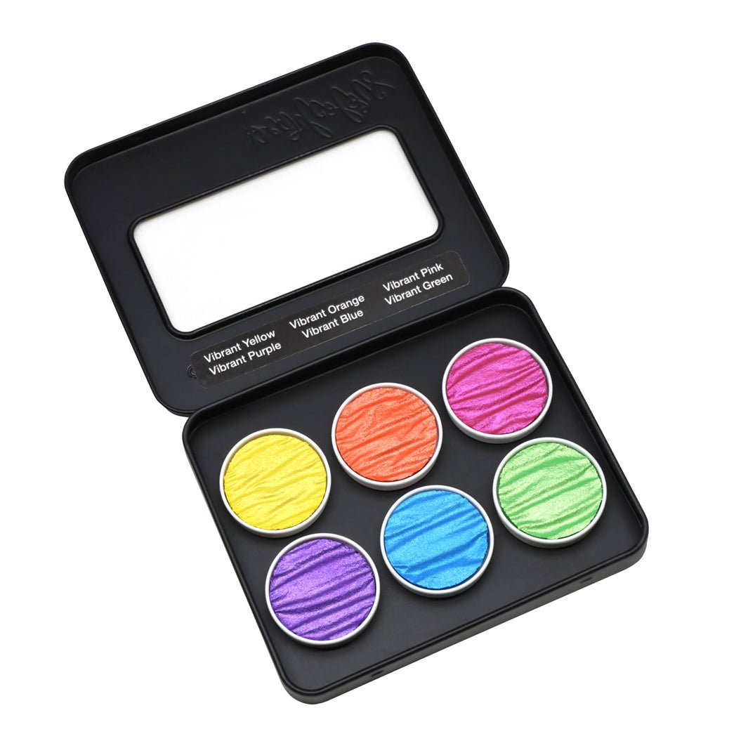 Este es el set de acuarelas Coliro Vibrant; el estuche trae 6 pastillas en tonos neón metálicos, intensos y súper saturados: M043 Vibrant Yellow, M044 Vibrant Orange, M045 Vibrant Pink, M046 Vibrant Purple, M047 Vibrant Blue y M048 Vibrant Green. ¡También los tenemos disponibles por separado!