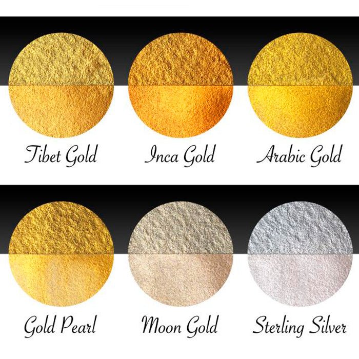 Este es el set de acuarelas Coliro Gold & Silver. Este estuche trae 6 pastillas en los siguientes colores: Tibet Gold, Inca Gold, Arabic Gold, Gold Pearl, Moon Gold y Sterling Silver.