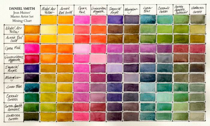 El set de acuarelas Daniel Smith Jean Haines Master Set incluye 10 tubos de acuarela de 5 ml cada uno, en los colores: amarillo níquel azo, oro rojo australiano, rosa ópera, magenta quinacridona, púrpura imperial, brillo lunar, azul lunar, verde cascada, apatita verde genuina y verde submarino.