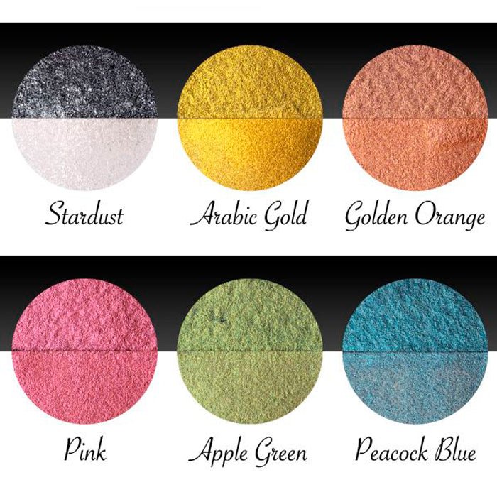 Este es el set de acuarelas Coliro Candy. Este estuche trae 6 pastillas en los siguientes colores: Stardust (M021), Arabic Gold (630), Golden Orange (M005), Pink (M018), Apple Green (M020) y Peacock Blue (M013). Stardust es un tono que trae únicamente glitter, sin color; úsalo para dar efectos de brillo o combínalo con otros tonos de Coliro para darles aún más resplandor.