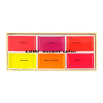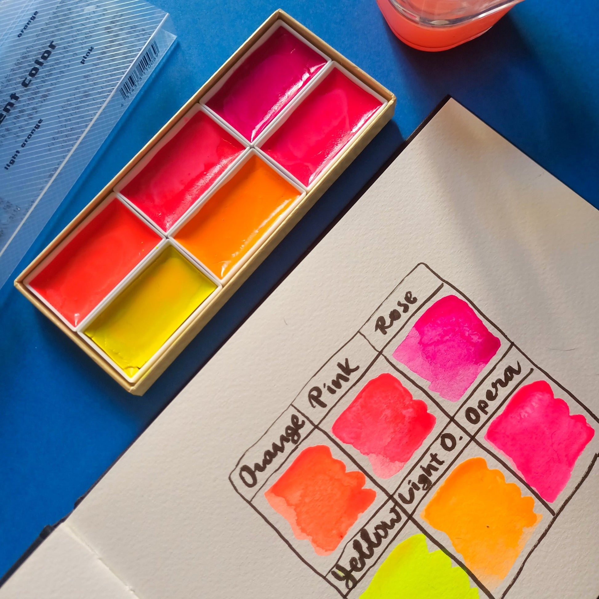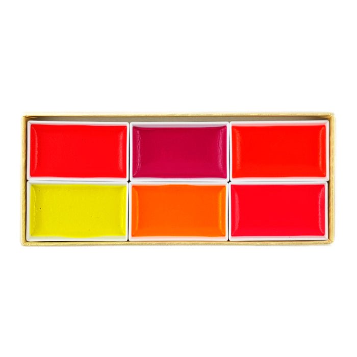 El estuche de acuarelas Kissho Lumi incluye 6 pastillas tamaño japonés en los siguientes colores neón: ópera, rosáceo, naranja, amarillo, naranja claro y rosa.