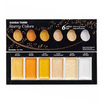 Las acuarelas Kuretake Starry Colors son parte de la famosa colección Gansai Tambi. Esta bella paleta se enfoca en matices dorados y plateados, e incluye 6 pastillas metálicas en los colores: Blue Gold, Red Gold, Yellow Gold, Champagne Gold, Light Gold y White Gold (plata).