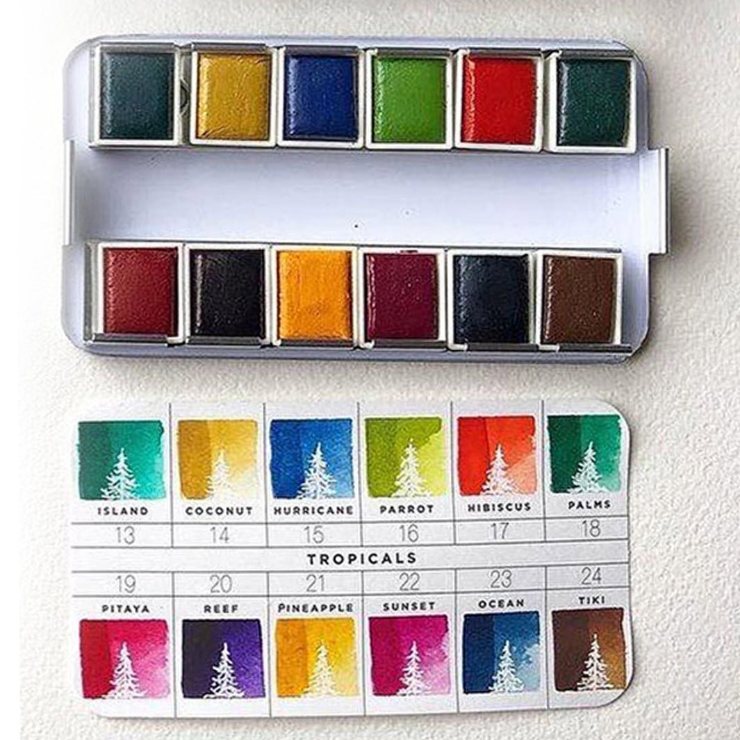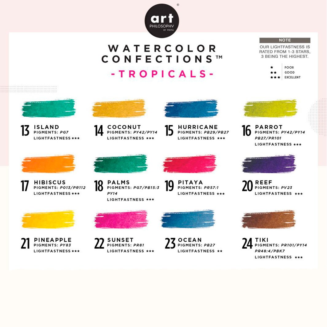 Este es el set Tropicals de la colección de acuarelas Confections de Art Philosophy (Prima Marketing). Los colores de este set fueron elegidos para pintar paisajes tropicales: tonos vibrantes e intensos, con rosas, rojos y verdes. ¡Es perfecto para completar tu colección de acuarelas!