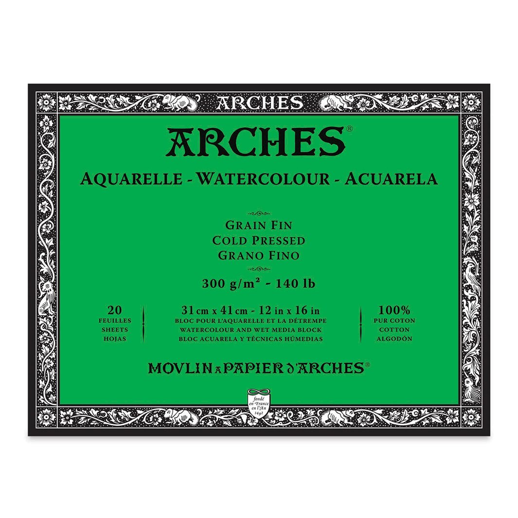 Este block de papel Arches Aquarelle cold press viene engomado en los cuatro lados, mide 31 x 41 cm, y trae 20 hojas de 300 g, 100% algodón.