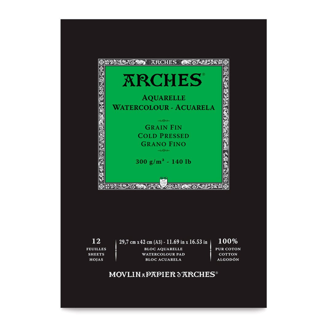 Este block de papel Arches Aquarelle cold press viene engomado en la parte superior y trae 12 hojas de 300 g, 100% algodón.