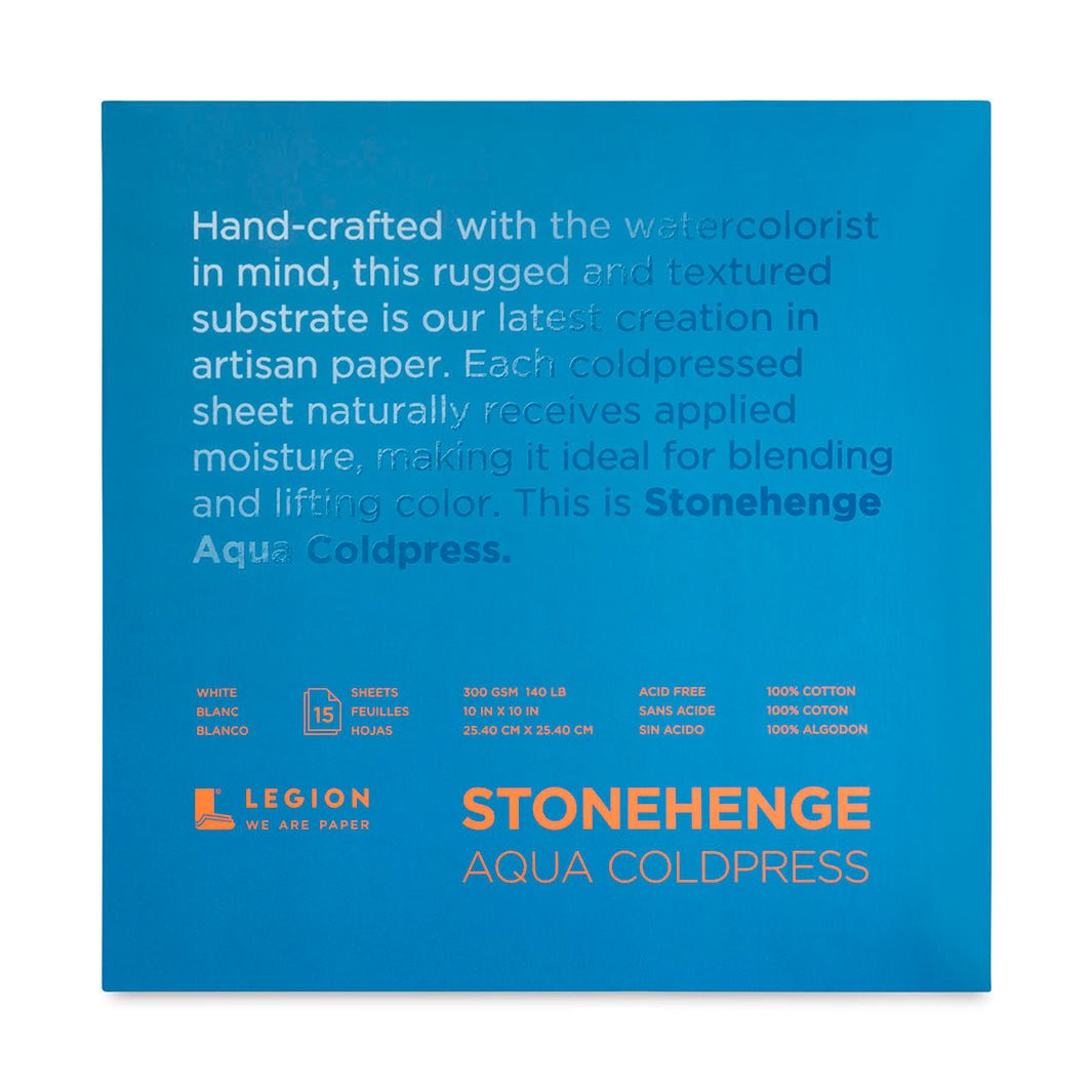 El papel Stonehenge Aqua Cold Press es puro algodón, sin ácidos, de textura fina. Cada block trae 15 hojas de 300 g.