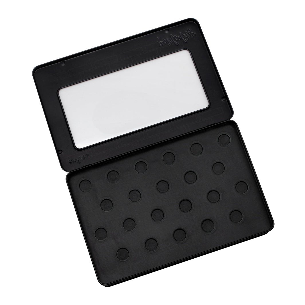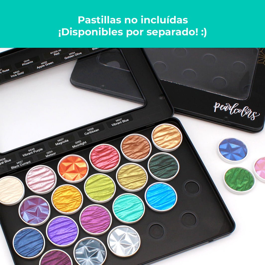 Esta cajita metálica tiene espacio para 22 pastillas Coliro. Es de un color negro intenso por fuera y de un negro suave por dentro, parte de la tapa es transparente para que puedas ver qué colores tienes contigo. ¡Es ligero y práctico, perfecto para viajar!