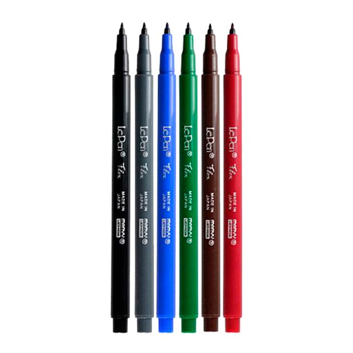 Este es el set de brush pens Uchida Le Pen Flex Primary; incluye 6 colores en tonos básicos: Black, Red, Blue, Green, Brown y Dark Grey.