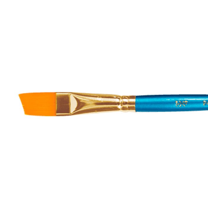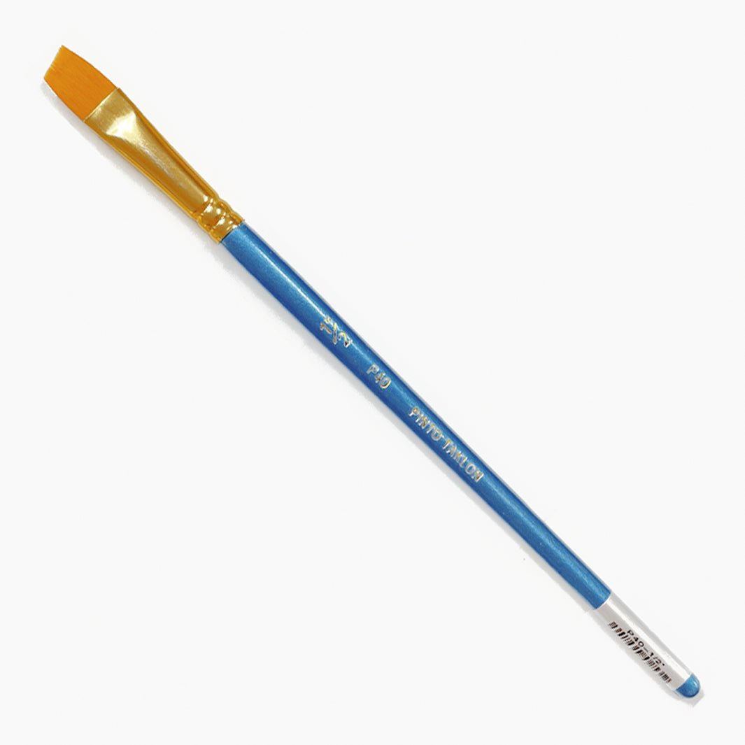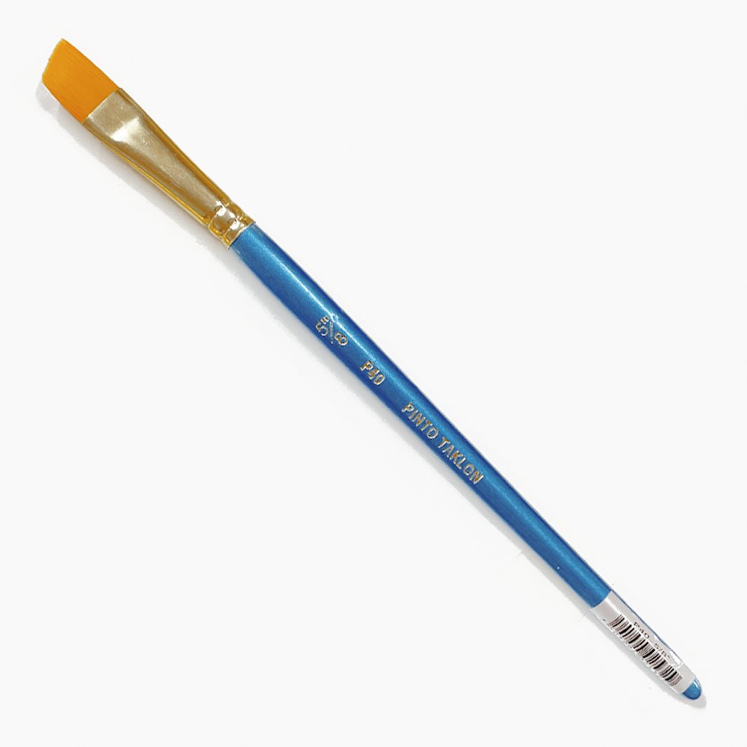 El pincel P40 de Pinto es un pincel de forma angulada o de cincel y de cerdas sintéticas de taklón dorado. El pelo es suave y firme, ideal para usar con acrílicos, acuarelas, gouaches, óleos y tintas.