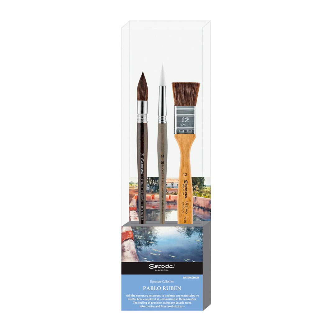 Este set es una colaboración con el reconocido acuarelista Pablo Rubén, e incluye 3 pinceles: un Perla redondo 1430 #14, un mop Último 1530 #14 y una brocha Último 2330 #12.