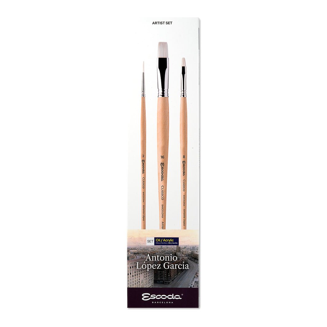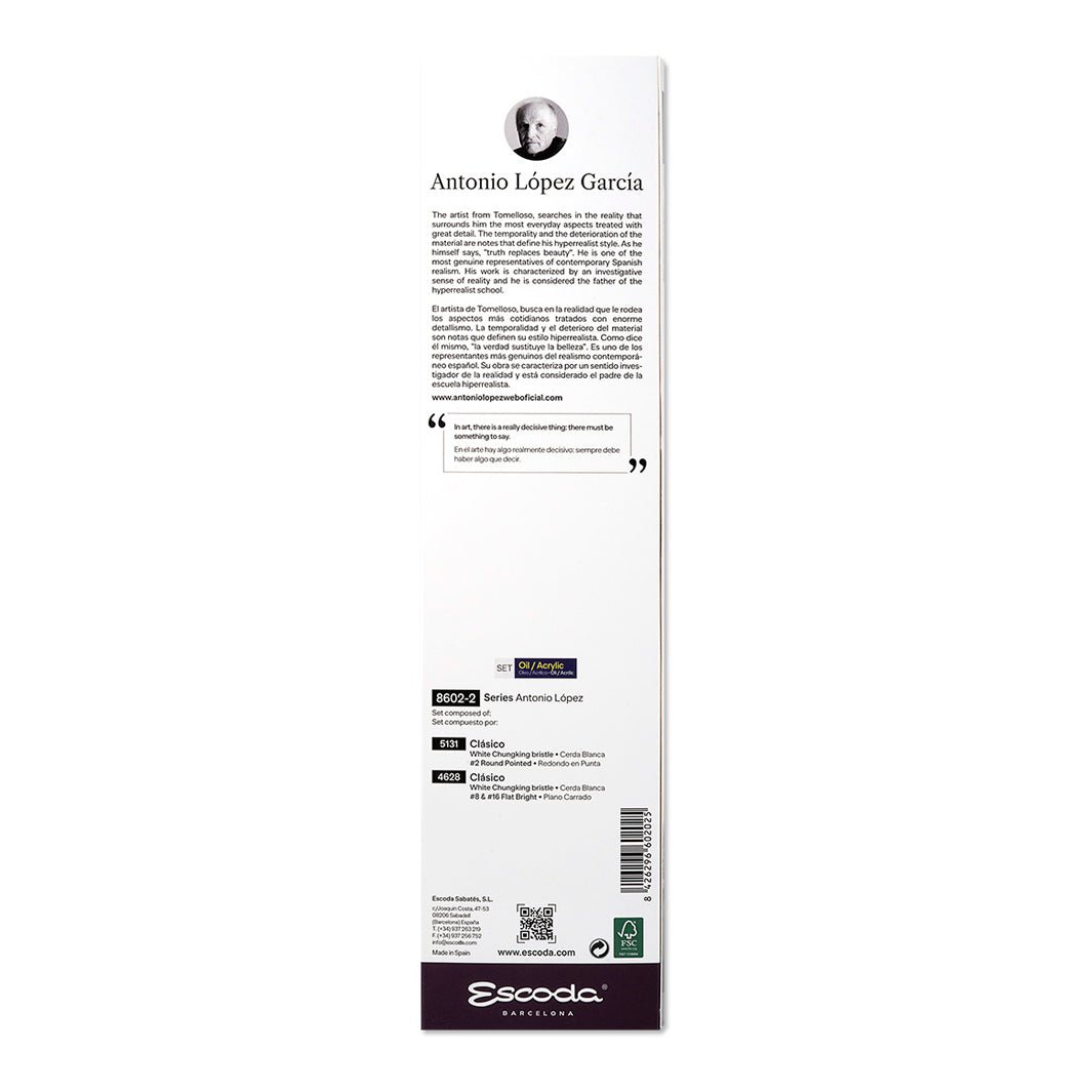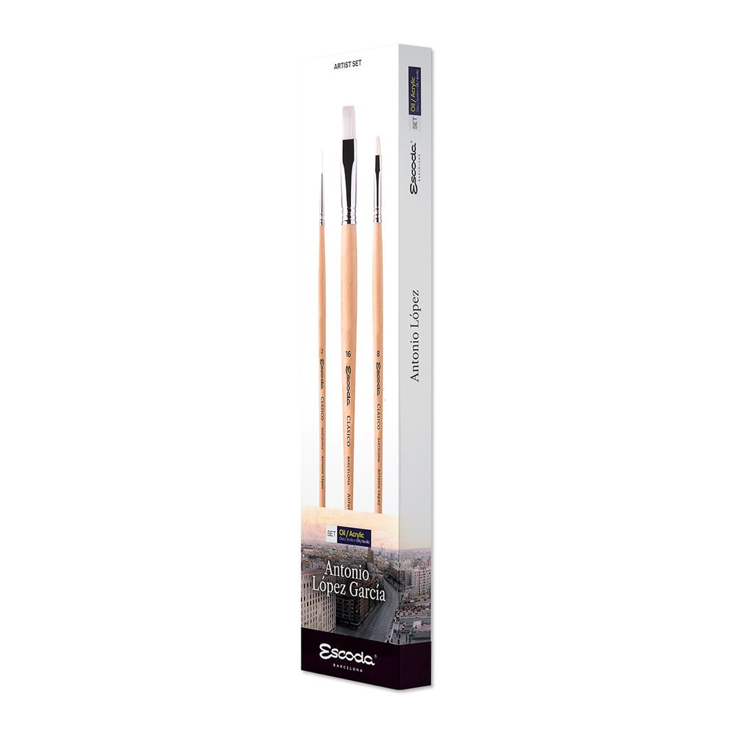 Este set es una colaboración con el reconocido artista madrileño Antonio López García e incluye 3 pinceles de la preciosa línea Clásico: un redondo #2, un plano #8 y un plano #16.