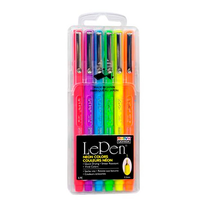Este es el set de rotuladores Uchida Le Pen Neon; incluye 6 colores en tonos fluorescentes: Fluorescent Blue, Fluorescent Green, Fluorescent Yellow, Fluorescent Orange, Fluorescent Violet y Fluorescent Pink.