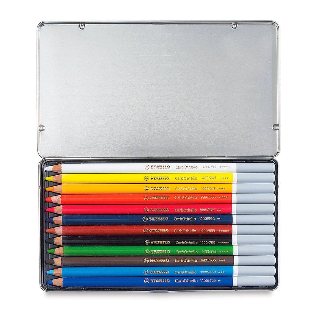 Este set de lápices pastel Carbothello con 12 colores viene en estuche metálico e incluye los tonos: Carmine Red Deep 310, Vermilion Red 305, Indian Yellow 215, Neutral Yellow 205, Leaf Green 575, Cyan Blue 450, Ultramarine Blue 405, Prussian Blue 390, English Red Deep 655, Bistre 635, Neutral Black 750, and Titanium White 100.