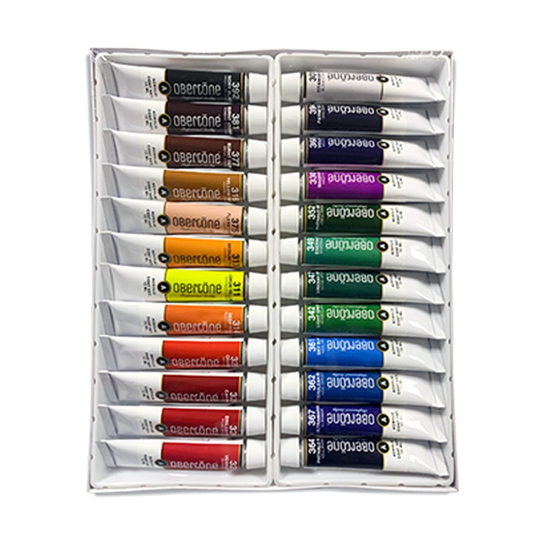 Este set incluye 24 colores, cada uno en tubo de 12ml: Blanco de titanio, amarillo limón, amarillo medio, amarillo oscuro, ocre amarillo, naranja, bermellón, rojo brillante, carmín, magenta, verde claro, verde viridiano, esmeralda, verde ftalo, azul cielo, azul cerúleo, azul ftalo (cyan), azul ultramar, violeta, tono piel, siena tostada, sombra tostada, negro de marfil y gris de Payne.