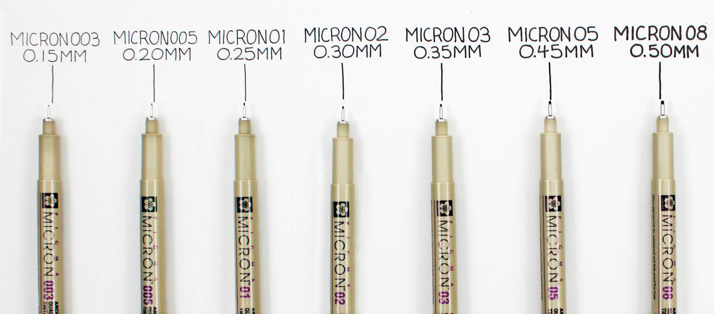 Los estilógrafos Sakura Pigma Micron están disponibles en 9 tamaños diferentes: 003, 005, 01, 02, 03, 04, 05, 08 y B (pincel).